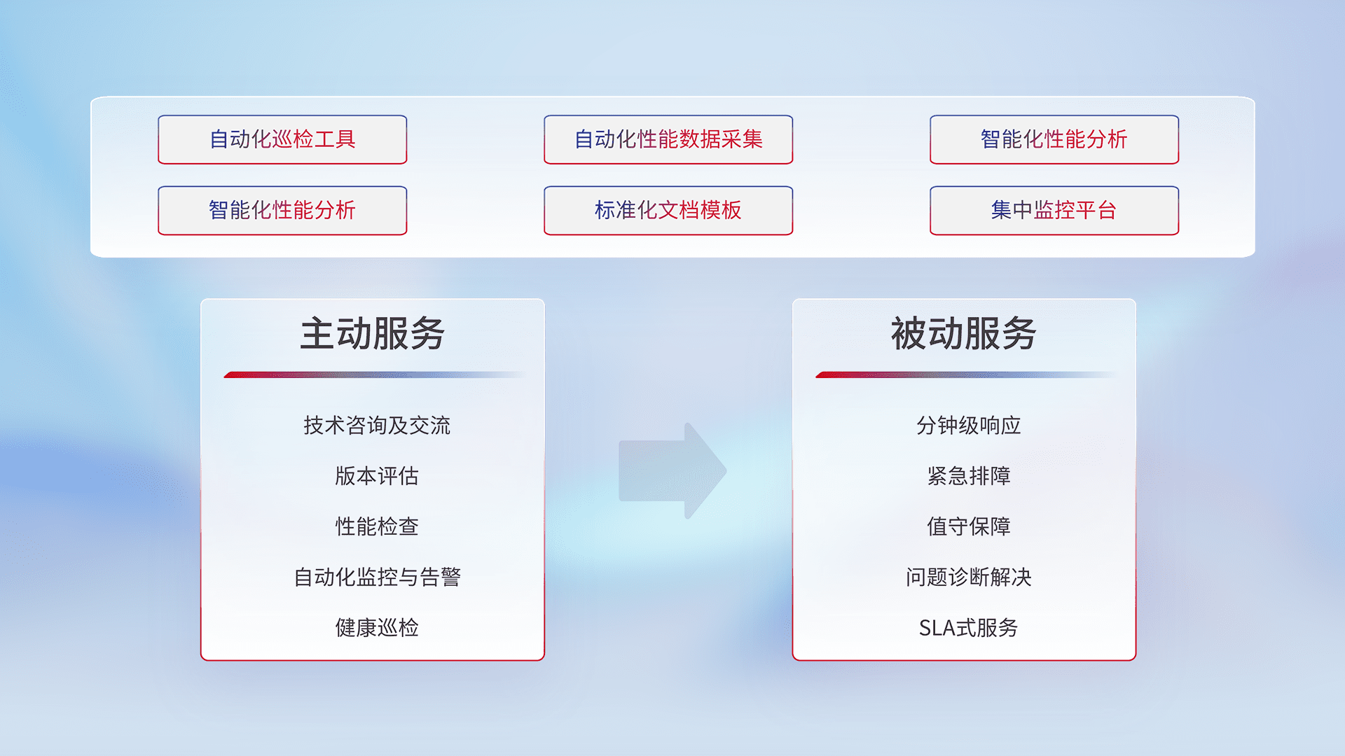 智能化工具和标准化文档,,保障服务质量,,,,提供主动服务(包含技术咨询、、、、版本评估、、、、性能检查、、、、自动化监控与告警、、健康巡检)和被动服务包含(分钟级响应、、、、紧急排障、、、值守保障、、、、问题诊断解决、、、、SLA服务)。。。
